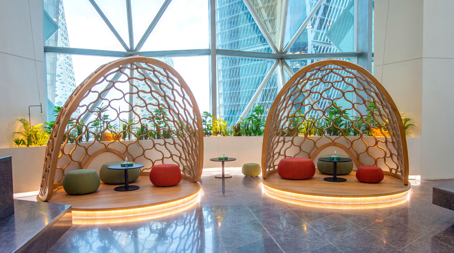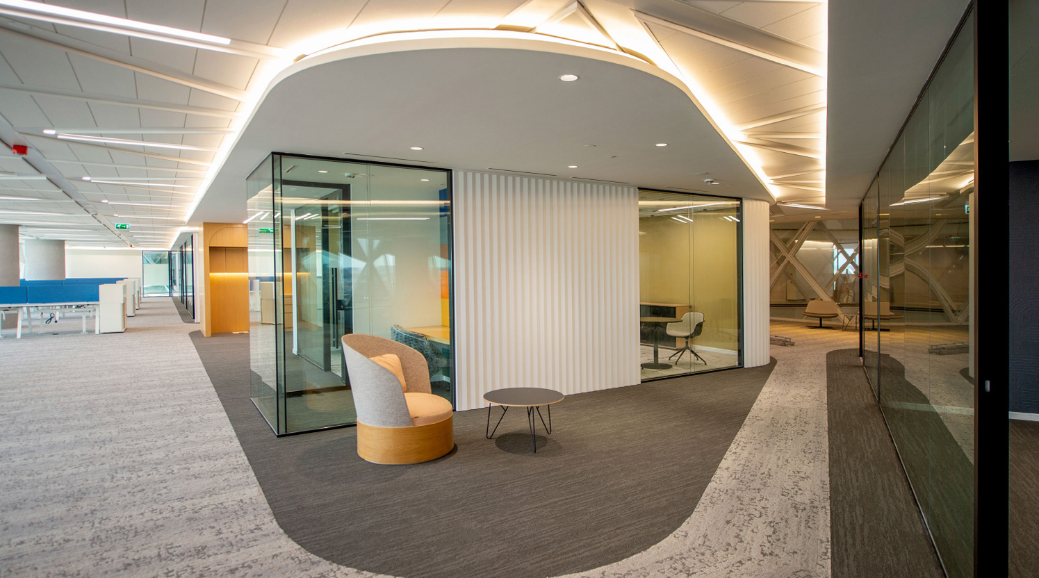 The fit-out for SNB headquarters at KAFD incorporates a professional and corporate aesthetic to align with its corporate imagery. This includes a neutral color palette, high-quality materials, and a clean design.