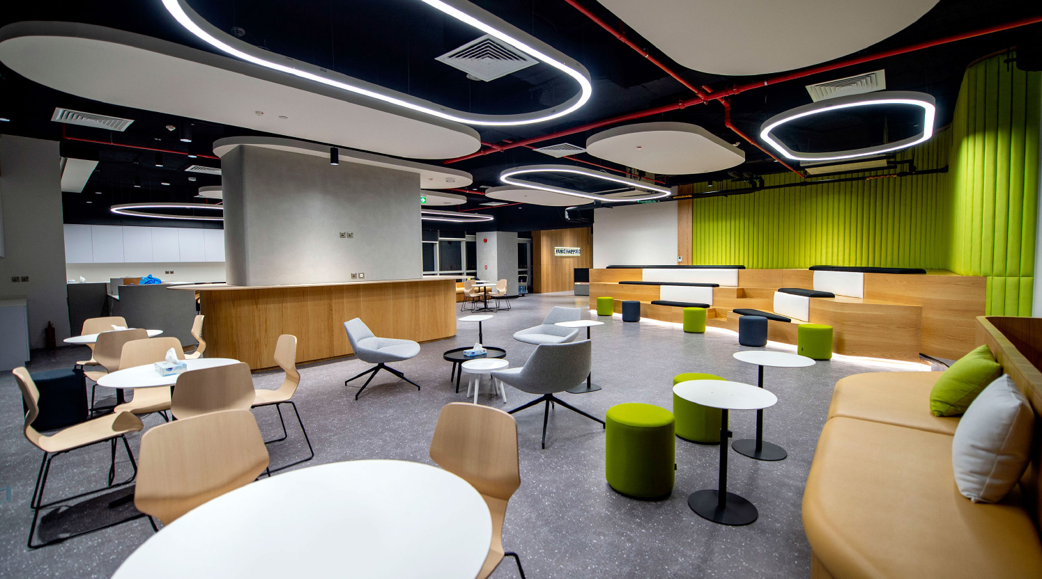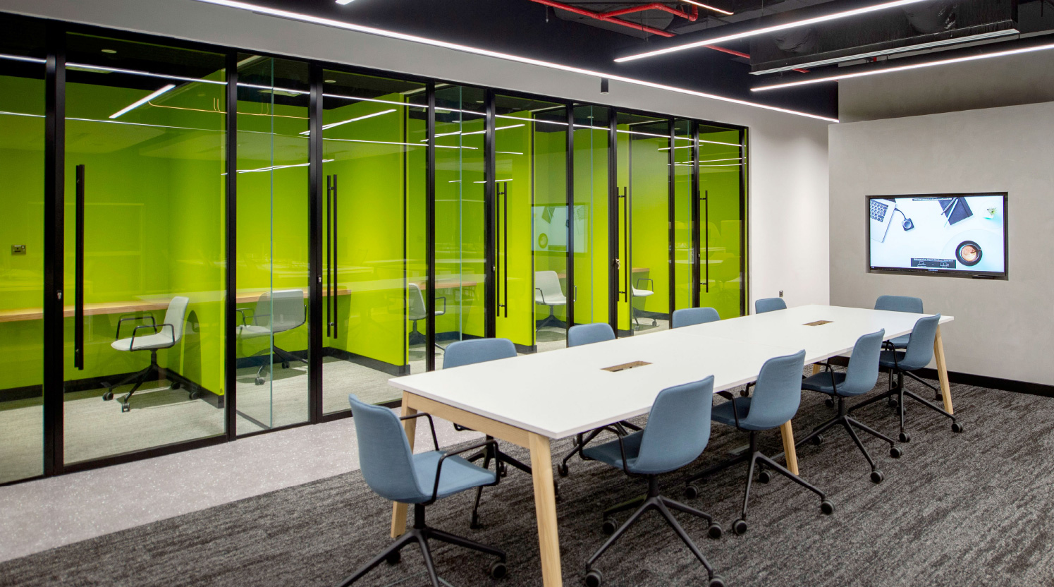 Buro Happold corporate offices in Riyadh have been tastefully implemented to meet specific functional and aesthetic requirements. This has been done through transforming the space into a tailored environment that supports the company's needs while reflecting its identity colors.